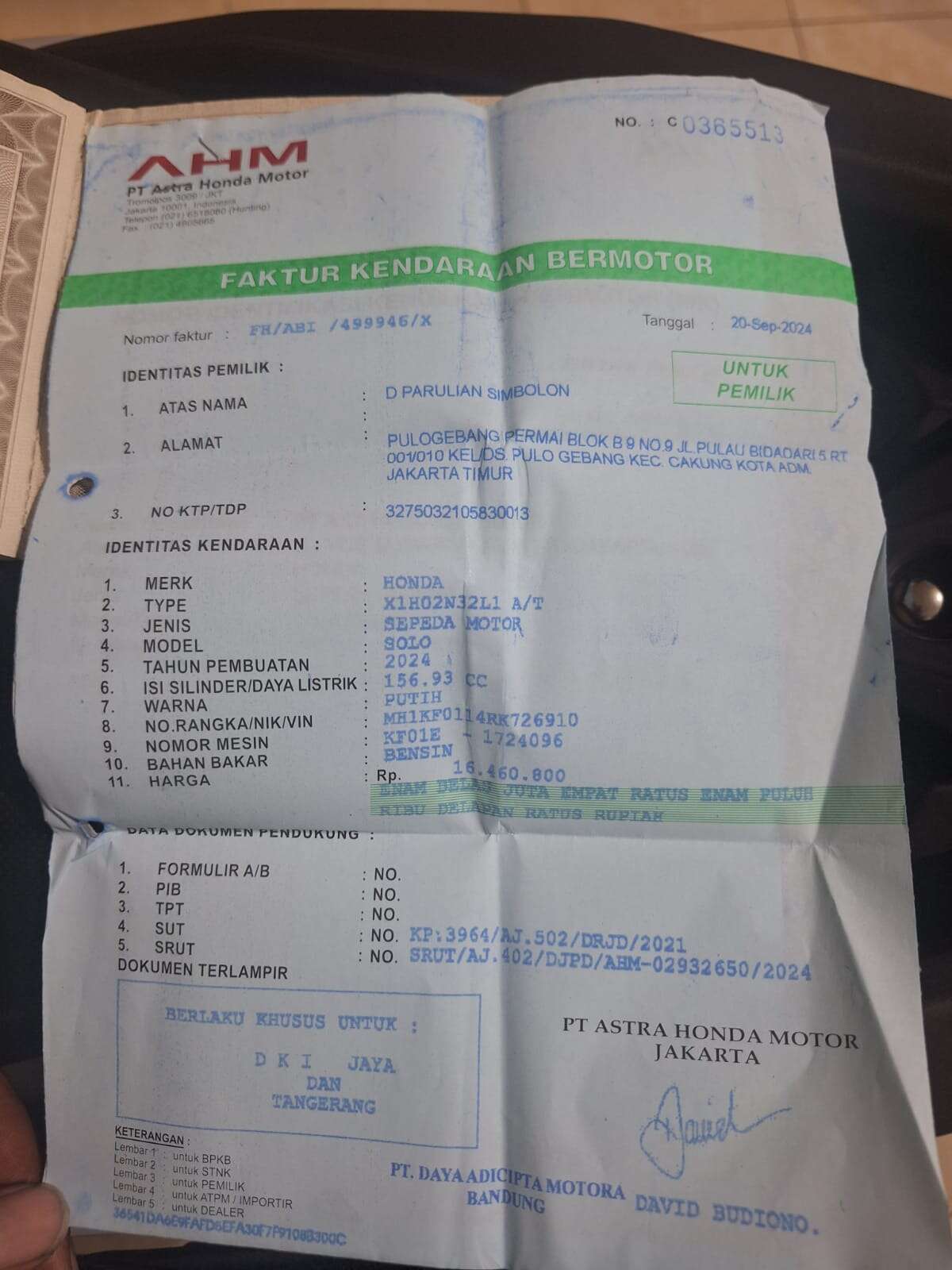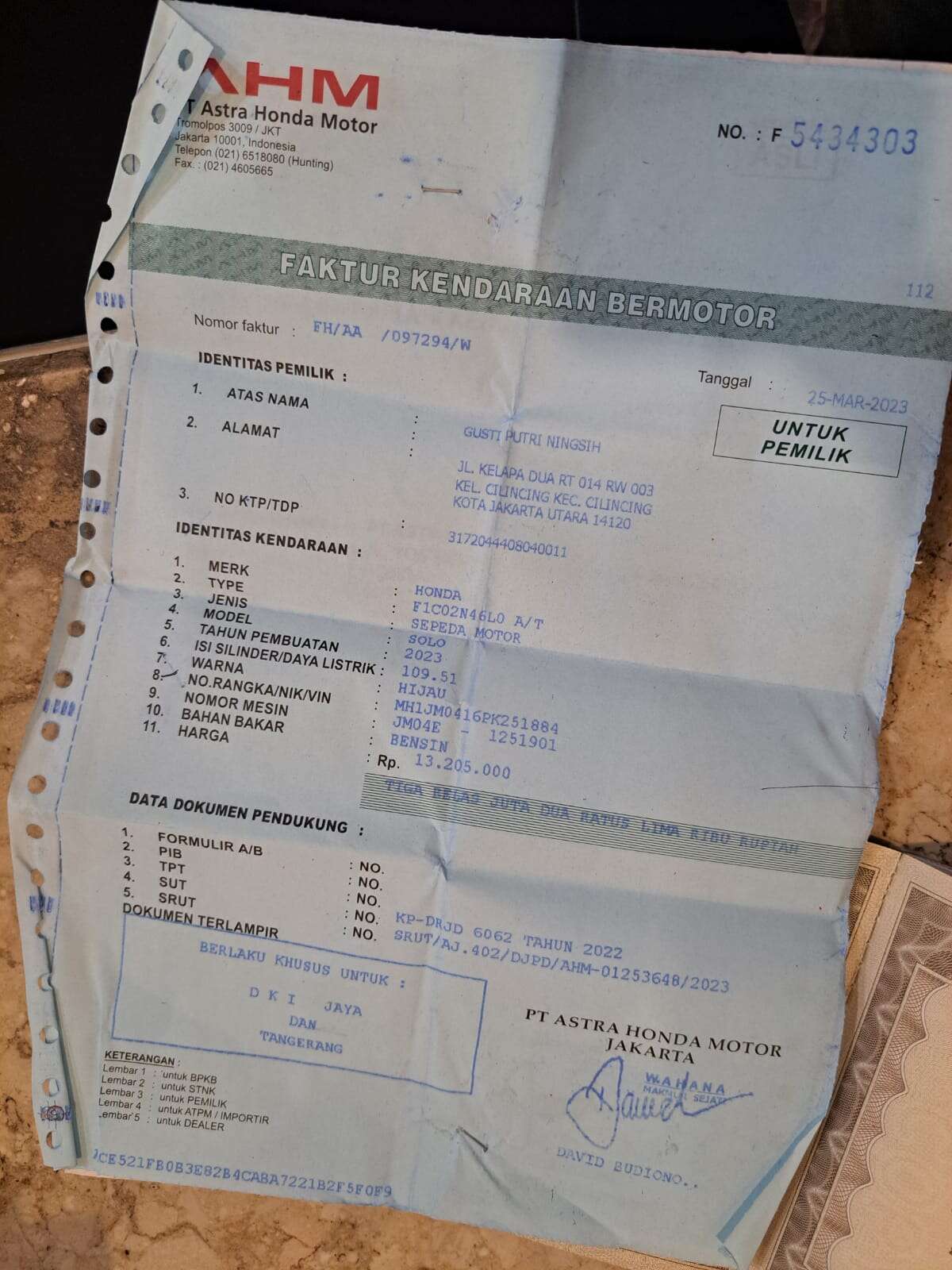 - Nomor Polisi B 3813 WCR