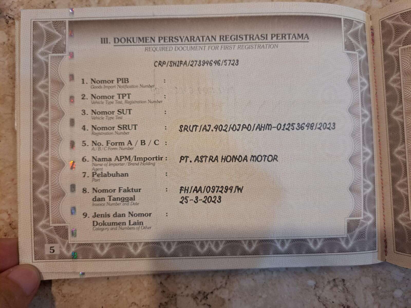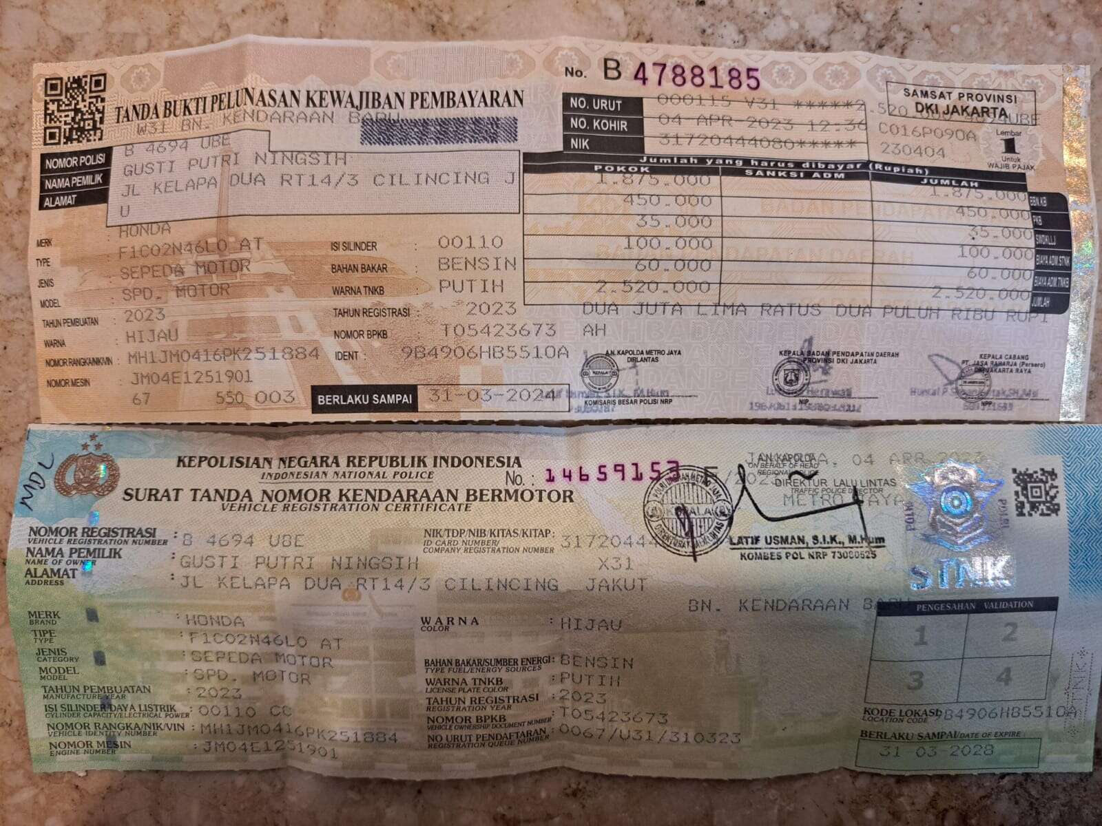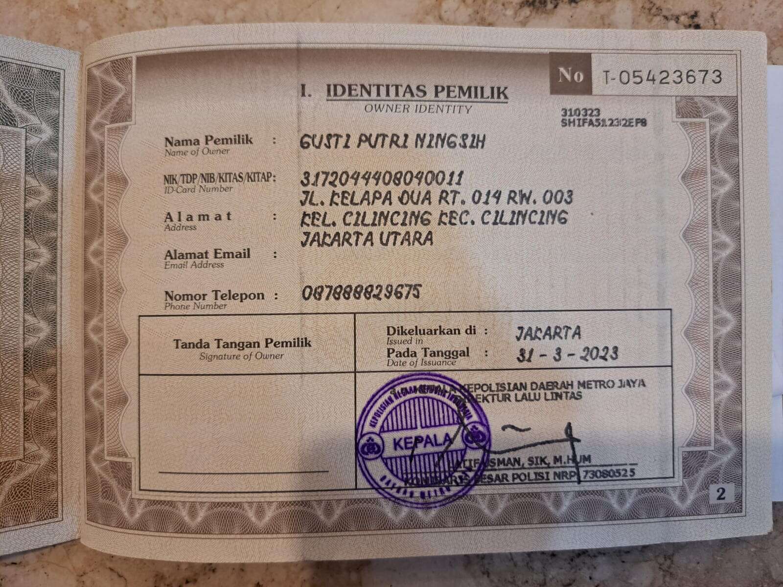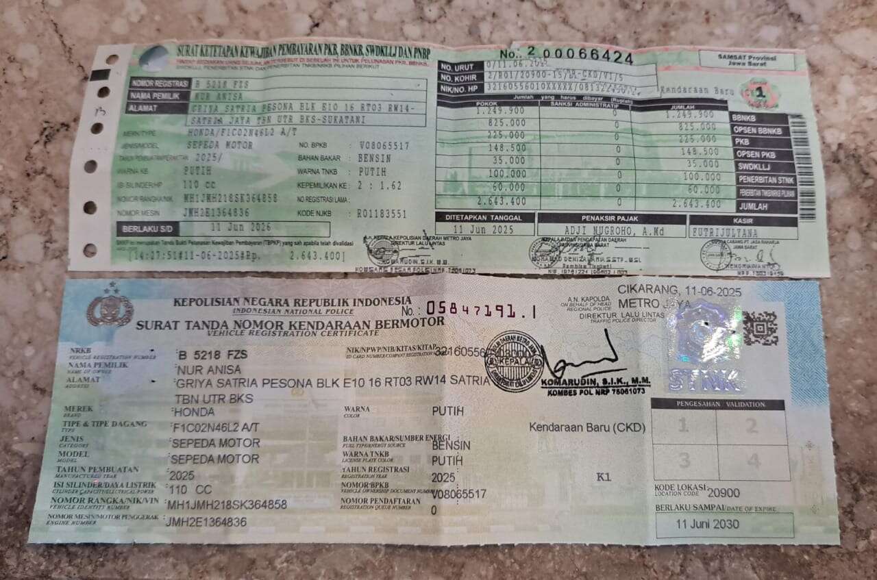 - Nomor Polisi B 5100 TJS